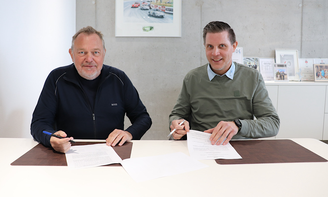 KSB-Präsident Michael Koop (l.) und Geschäftsführer des Autohauses Bartels Carsten Bartels (r.) bei der Vertragsunterzeichnung. (Foto: KSB Emsland)