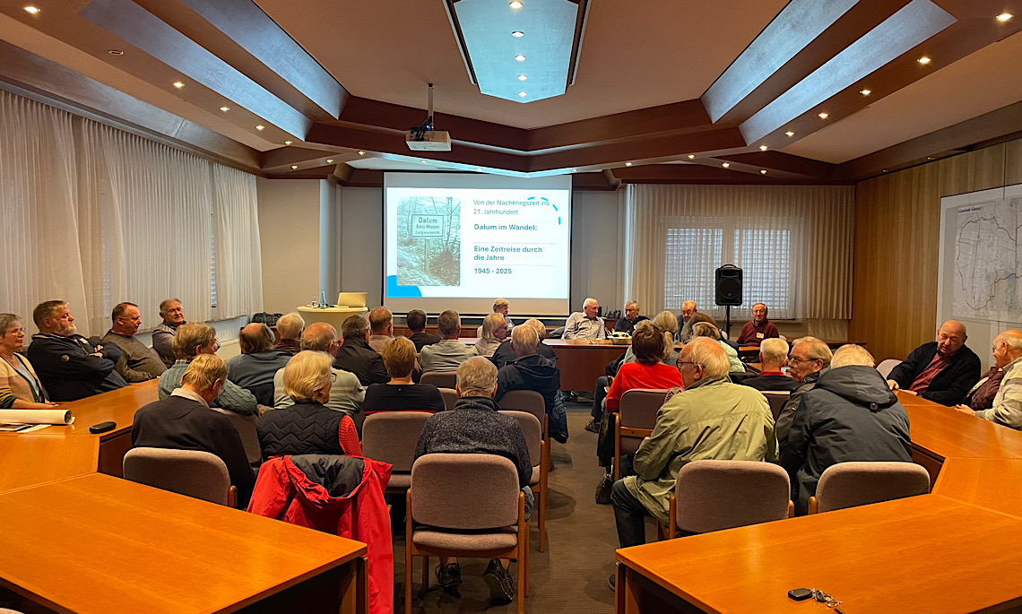 Ein stetes, zustimmendes Murmeln im Publikum zeigte, dass viele Zuhörer eigene Erinnerungen wachriefen und die gemeinsame Zeitreise durch Dalums Geschichte sichtlich genossen. Manche Zuhörer nutzten die Gelegenheit, eigene Erinnerungen und Anekdoten beizusteuern, was den Vortrag lebendig und persönlich machte. So wurde deutlich, dass Dalum trotz seiner ländlichen Prägung einem stetigen Wandel unterliegt und jede Generation ihr eigenes Kapitel zur Dorfgeschichte beiträgt.