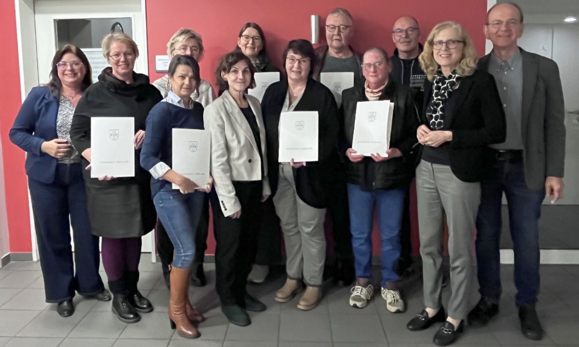(v. l.) Kerstin Knoll, (Seniorenstützunkt Landkreis Emsland), Gabriele Behrens (Heede), Lena Struhschein (Kluse), Andrea Koop (Heede), Angela Waschull (Dozentin und Kursleiterin) Rita Robben (Börger), Anette Roling (Papenburg), Karl-Heinz Brunßen-Gerdes (Lathen), Maria Bröring (Herbrum), Eduard Sandmann (bereits erfahrener DUO aus Dörpen), Sozialdezernentin Dr. Sigrid Kraujuttis (Landkreis Emsland) und Stefan Varel (Leiter der KEB Ostfriesland-Emsland e. v.). Auf dem Foto fehlen Sigrid Baalmann (Dörpen) und Bettina Stratmann (Oberlangen). (Foto: Landkreis Emsland)