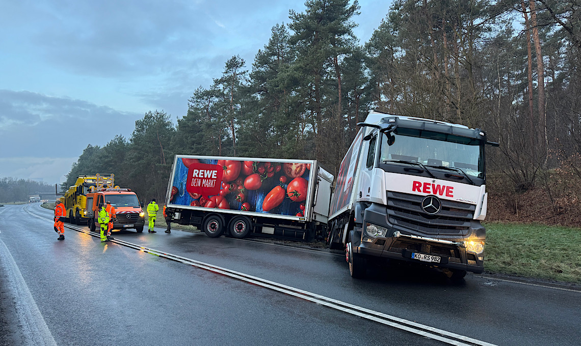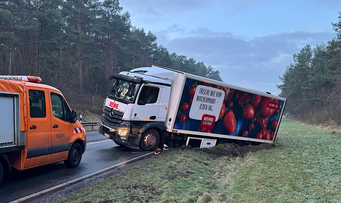 In Lingen kam ein Lastwagengespann auf der B70 von der eisglatten Fahrbahn ab und landete im Seitenraum (Foto: Matthias Brüning)