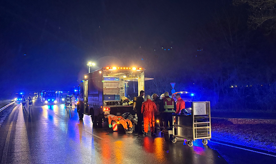„Das ist ein ätzender Stoff, dessen Dämpfe natürlich nicht eingeatmet werden dürfen und der auch sehr umweltgefährdend ist, sodass wir hier mit schweren Chemikalien-Schutzanzügen arbeiten und die Einläufe für Regenwasser gesichert haben, sodass nichts ins Erdreich eindringen kann“, so Markus Schüler, Stadtbrandmeister der Feuerwehr Haselünne. Die B402 wurde im Rahmen des Einsatzes voll gesperrt. Zahlreiche Lkw-Fahrer standen stundenlang im Stau.