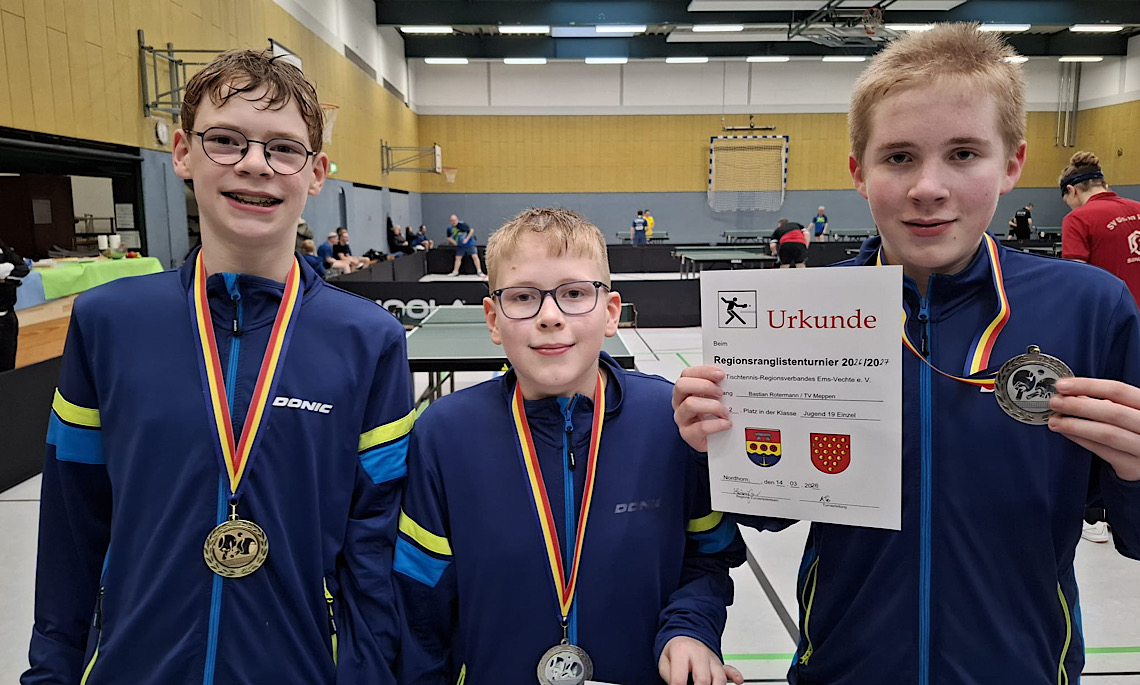 Nordhorn/Meppen (pm). Bei der Tischtennis Regionsrangliste am vergangenen Samstag (14.03.2026) in Nordhorn zeigten die Athleten des TV Meppen erneut starke Leistungen und kehrten mit zahlreichen Podestplätzen zurück. Mit 18 Nachwuchsspielern und sechs Erwachsenen stellte der Verein die größte Teilnehmerzahl vor Ort.