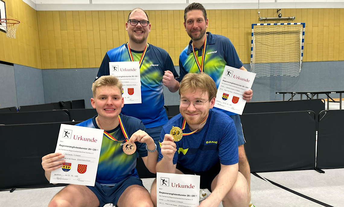 Bei den Erwachsenen feierte der TV Meppen ebenfalls große Erfolge und erzielte vier Medaillen. In der Konkurrenz Herren I erkämpfte sich Finn Gumprich mit einer Bilanz von 7:1 den Titel in vielen spannenden Duellen. Phil Gerdes rundete das starke Ergebnis in der höchsten Spielklasse mit Rang 3 ab.