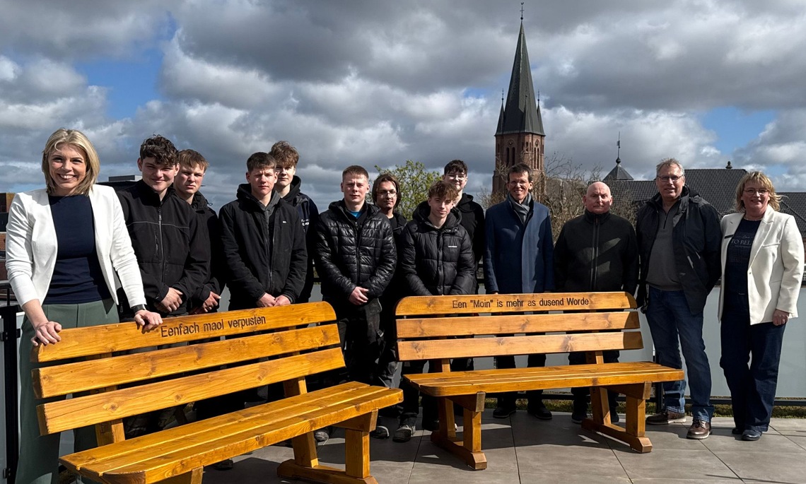 Bürgermeisterin Vanessa Gattung zeigte sich bei der Übergabe erfreut: „Die neuen Bänke sind ein starkes Beispiel für die Qualität der praktischen Ausbildung an den Papenburger Schulen. Die Bänke stehen den Mitarbeitenden auf der Dachterrasse zur Verfügung. Für das Engagement danke ich der gesamten Klasse herzlich.“