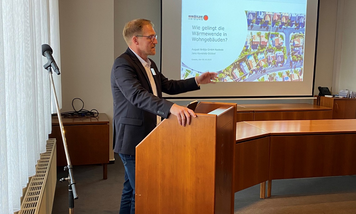 Vier Fachvorträge gaben praxisnahe Einblicke in die Wärmewende: Johannes Lorenz von der Energieeffizienzagentur Meppen erklärte die ersten Schritte und klaren Ziele der Wärmewende, während Christina Penning vom Ingenieurbüro Penning die Förderprogramme des Bundes zum energiesparenden Bauen und Sanieren vorstellte. Laurenz Menke von der Gemeinde Geeste berichtete, wie energieeffizientes Bauen und Sanieren in der Praxis gelingt, und Jens Kawaletz-Dübbel von Brötje Heizung informierte über praxisgerechte Heizsysteme für den Bestandsbau. Krankheitsbedingt entfiel der Vortrag von Schornsteinfeger Klaus Holterhaus. Die Vorträge fanden regen Zulauf, im Schnitt 20 bis 25 Zuhörer verfolgten die Präsentationen.