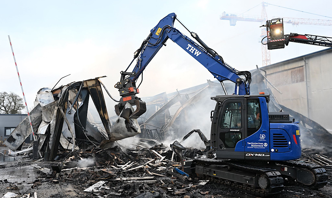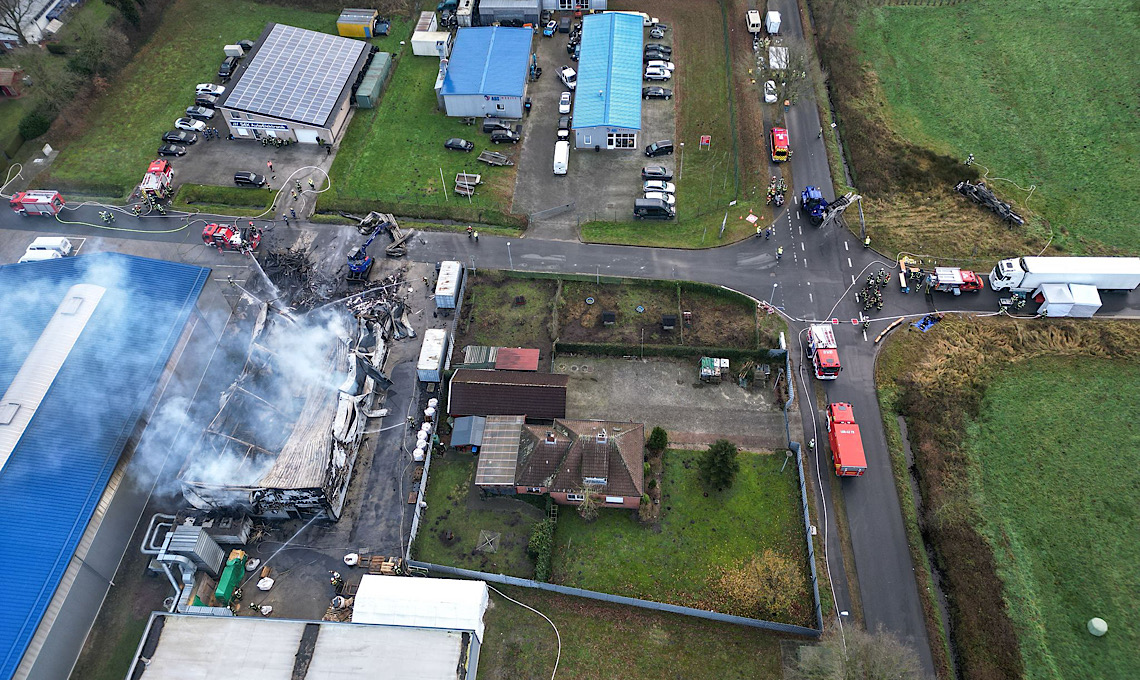 Die Lagerhalle samt Inhalt wurde vollständig zerstört und das Dach der Halle stürzte ein. Durch die Brandentwicklung wurde das Gebäude einer angrenzenden Firma ebenfalls beschädigt. Anwohner wurden gebeten ihre Türen und Fenster für die Dauer des Einsatzes geschlossen zu halten.