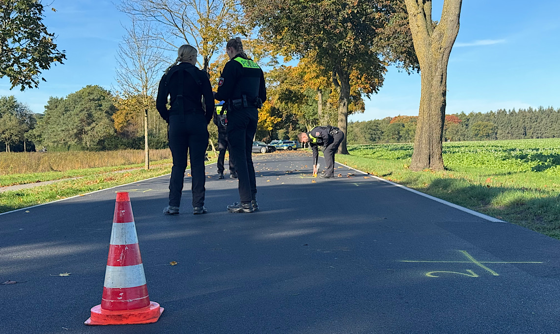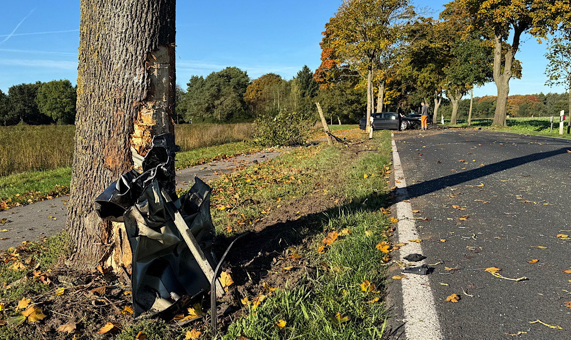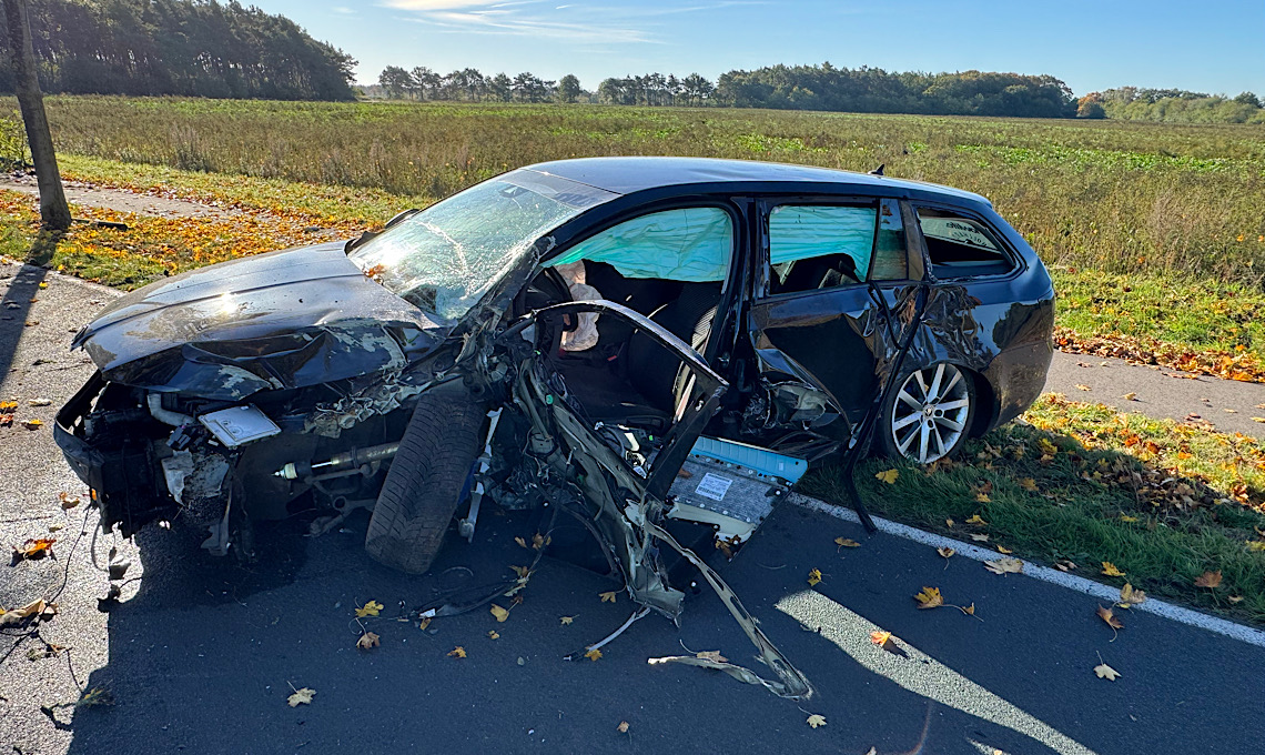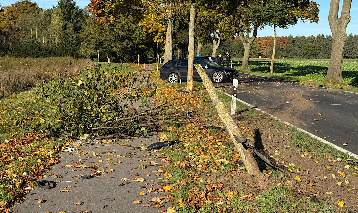 Der Unfall ereignete sich gegen 9:20 Uhr auf der Wierescher Straße. Der 32-jährige Fahrer des Pkw war aus Wesuwe kommend in Richtung A31 unterwegs, als er aus bislang ungeklärter Ursache nach links von der Fahrbahn abkam und mit insgesamt drei Bäumen kollidierte, wovon ein Bäum komplett umknickte.