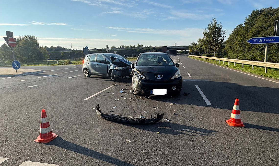 Dem Unfall ereignete sich gegen 16:30 Uhr im Kreuzungsbereich zur A31. Laut ersten Erkenntnissen war der Fahrer eines Mitsubishi Colt von Autobahn kommend in Richtung Haren unterwegs. Im Kreuzungsbereich zur B408 übersah der Mann dann die vorfahrtberechtigte 25-jährige Fahrerin eines Peugeot 207, die aus Rütenbrock kommend in Richtung Haren unterwegs war. Es kam infolgedessen zur Kollision der beiden Fahrzeuge, wobei beide Insassen verletzt wurden.
