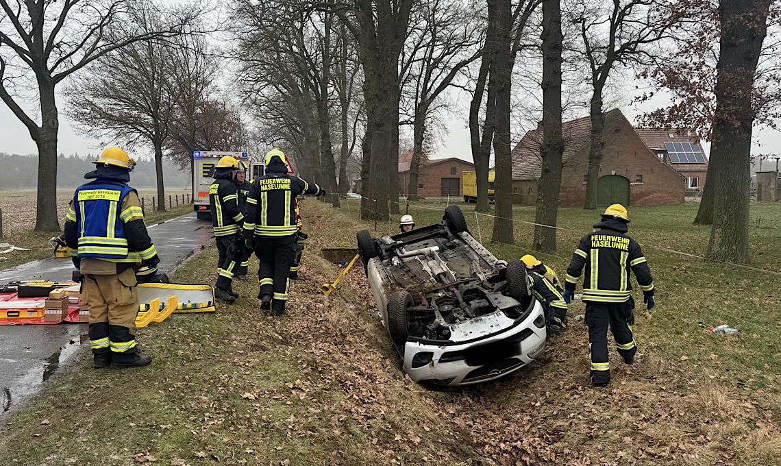 Die Fahrerin eins Pkw war auf der Straße Kreyenborg unterwegs, als sie auf spiegelglatter Fahrbahn die Kontrolle über ihr Fahrzeug verlor und kopfüber in einem Graben landete. Sie konnte sich nicht aus eigener Kraft aus dieser misslichen Lage befreien. Die Feuerwehr schaffte einen Zugang zum Auto holte die Frau hier heraus. Aufgrund der Straßenglätte konnten die Einsatzkräfte die letzten Kilometer auf dem Weg zum Unfallort kaum mehr als Schrittgeschwindigkeit fahren, so Markus Schüler, Einsatzleiter der Feuerwehr Haselünne.