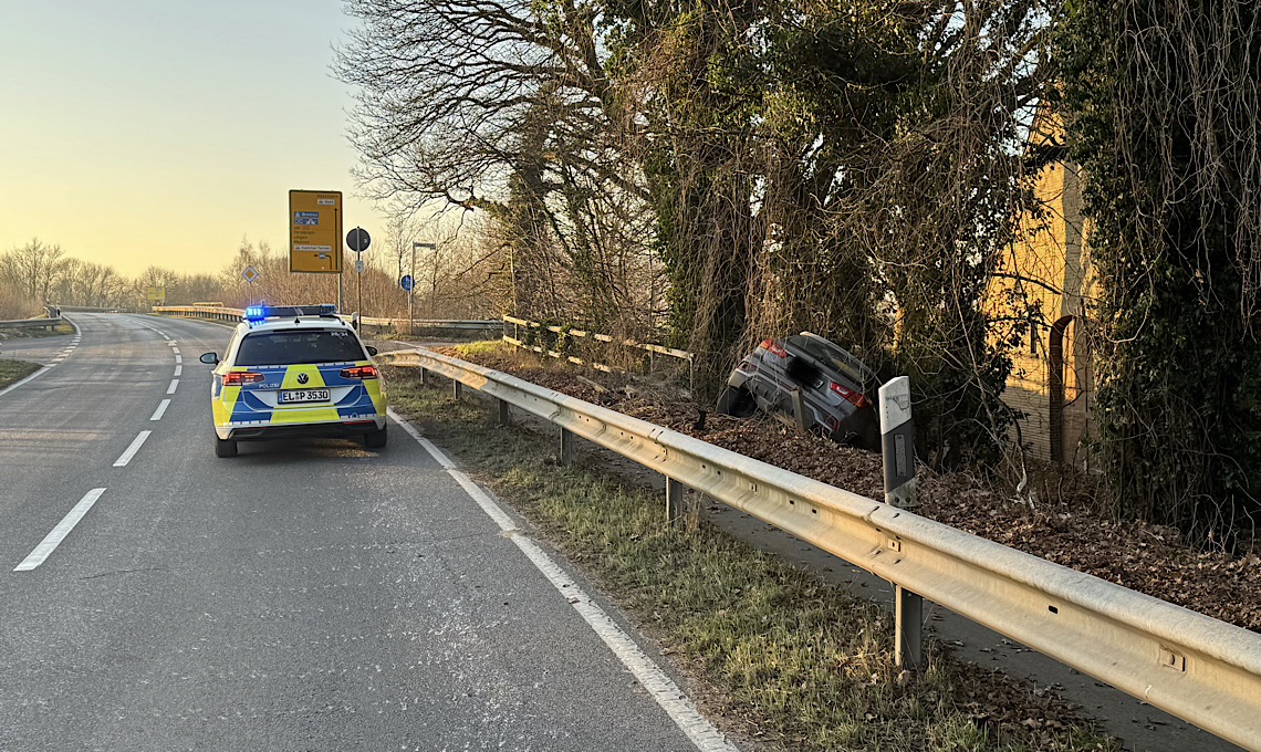 Hier ist aus bislang unklarer Ursache ein Mitsubishi aus Lähden kommend nach rechts von der Fahrbahn abgekommen und zwischen zwei Bäumen in einer Senke gelandet. Zuvor hatte der Pkw noch irgendwie die Schutzplanken überwunden.