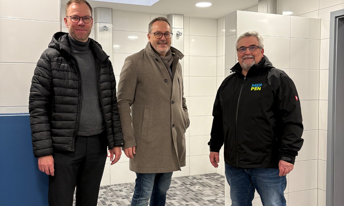Bürgermeister Helmut Knurbein (Mitte) zeigte sich erfreut über die modernen Sanitäranlagen der Johannes-Gutenberg-Sporthalle. Er wurde bei der Begehung von Christian Golkowski (links), Fachbereichsleiter Bildung, Familie, Jugend & Sport, und Klaus Keller (rechts), Fachbereichsleiter Hochbau, Gebäudewirtschaft & Liegenschaften, begleitet. (Foto: Stadt Meppen)