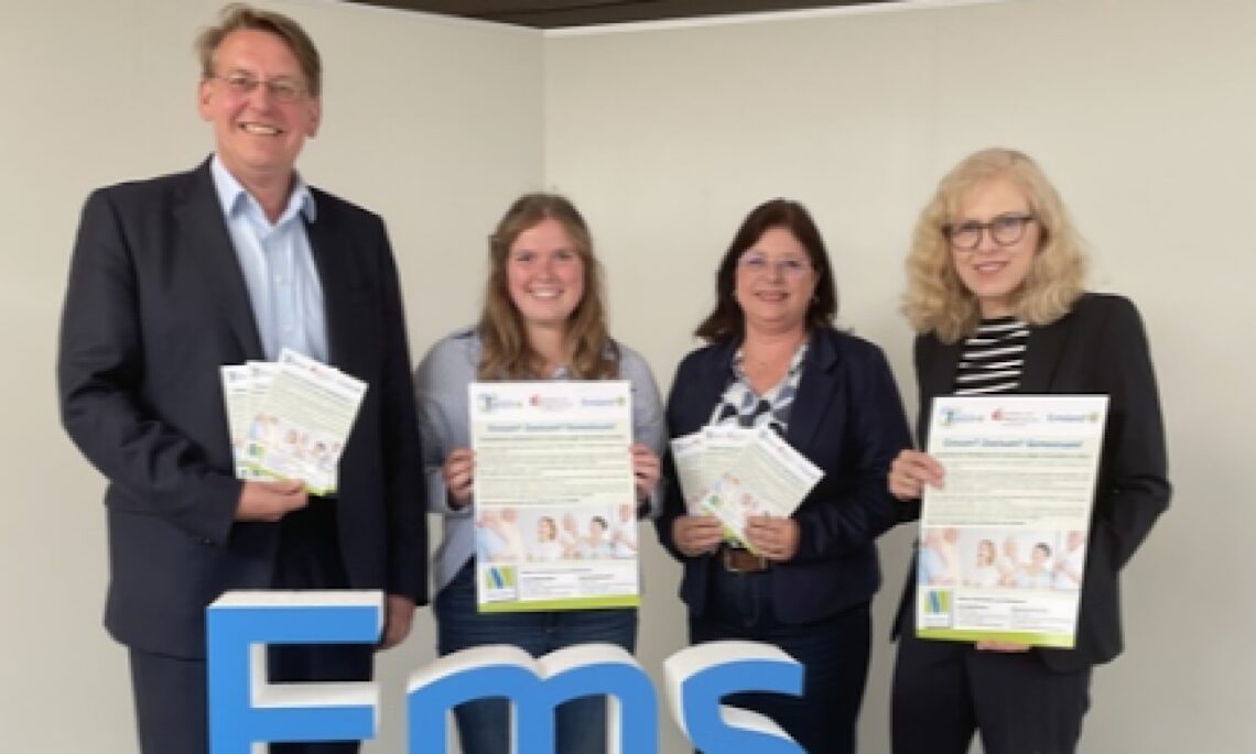 (v. l.) Landrat Marc-André Burgdorf, Daniela Fischer von der Gesundheitsregion, Kerstin Knoll vom Seniorenstützpunkt und Sozialdezernentin Dr. Sigrid Kraujuttis werben für die Teilnahme am Wettbewerb gegen Einsamkeit. (Foto: Landkreis Emsland)