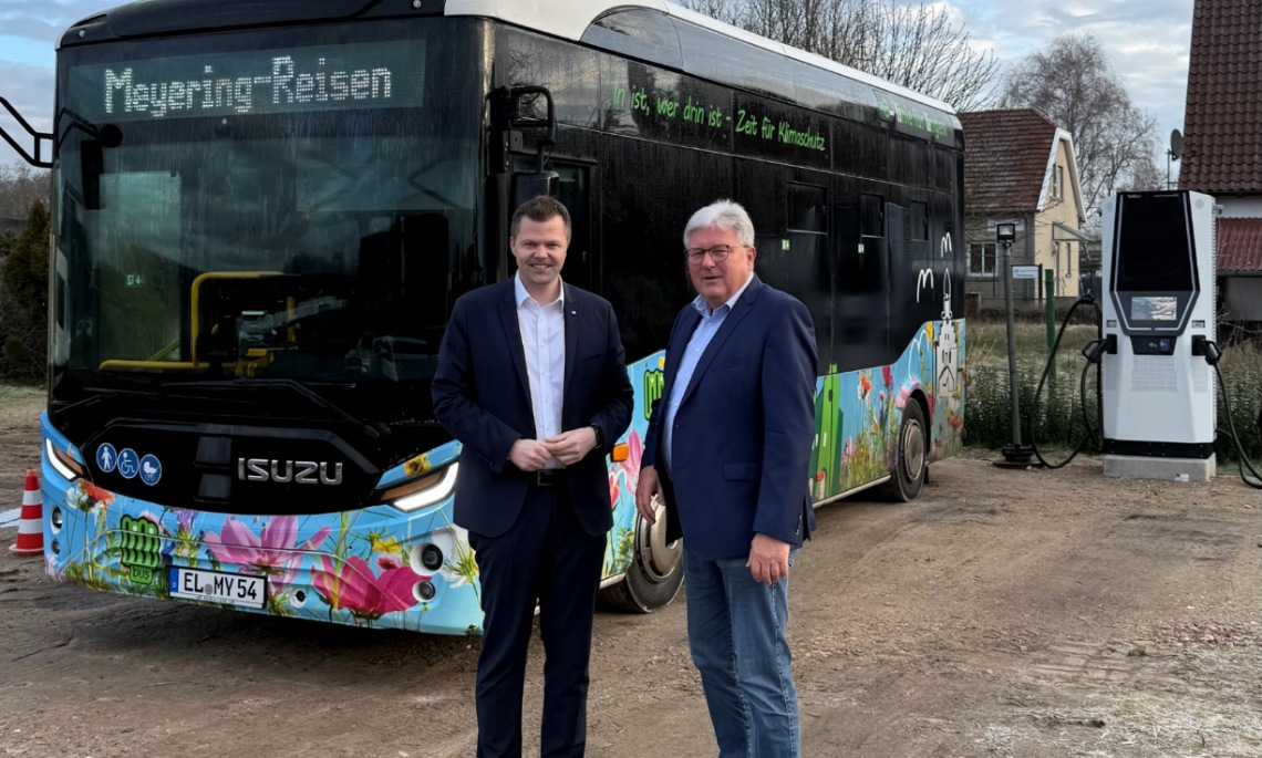 Der örtliche Landtagsabgeordnete Christian Fühner (l.) und Hermann Meyering von der Meyering Verkehrsbetriebe KG arbeiten gemeinsam an einem modernen, klimafreundlichen ÖPNV in Lingen und Umgebung. (Foto: Wahlkreisbüro Christian Fühner)