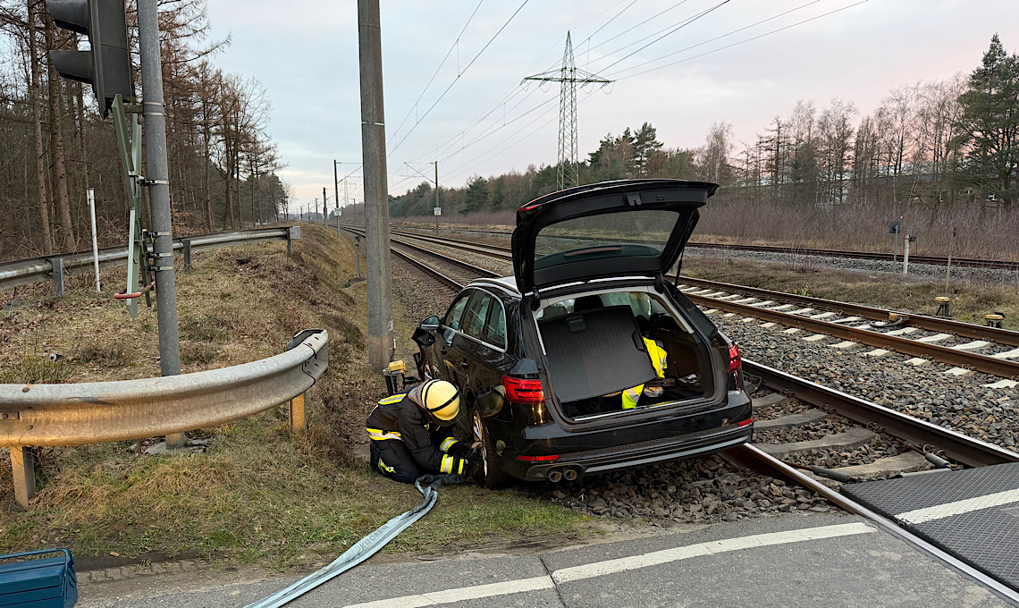 Rettungsdienst und Feuerwehr waren vor Ort. Verletzt wurde glücklicherweise niemand. Die Feuerwehr Meppen zog das Fahrzeug mit einer Seilwinde aus der misslichen Lage. Der Zugverkehr konnte zuvor noch rechtzeitig eingestellt werden, bevor es zu einem größeren Unfall hätte kommen können.