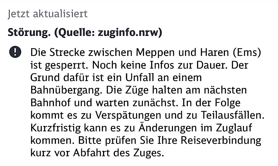 Die Bahnstrecke musste über mehrere Stunden bis etwa 20 Uhr in beide Richtungen gesperrt werden. Bis zum Abend kommt es weiterhin zu Verspätungen auf der Strecke zwischen Münster nach Emden und umgekehrt.