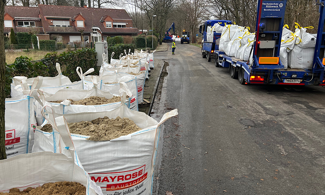 Die Einsatzkräfte sind mit einem massiven Aufgebot im Einsatz und kommen gut voran. Auch mehrere Firmen (Mayrose, Robben Bauunternehmen) beteiligen sich an der Aktion u.a. mit Fahrzeugen zum Transport von Sandsäcken und sogenannten BigPacks mit denen ein Deich errichtet werden soll.