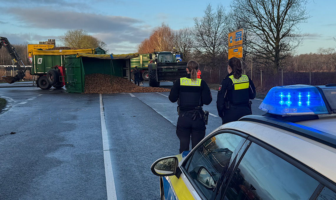 Der Unfall ereignete sich im Kreuzungsbereich zur Süd-Nord-Straße. Im Abbiegevorgang kippte ein mit Kartoffeln beladener Anhänger eines Treckergespanns auf die Seite und blockierte die Fahrbahn. Als Ursache kommt eine defekte Bremsanlage in betracht.