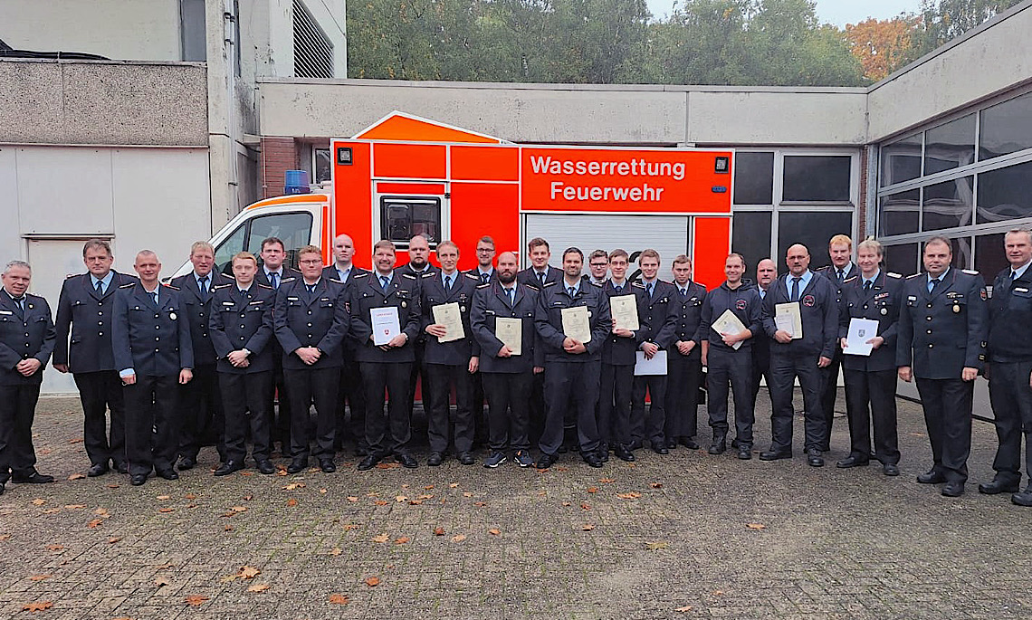 Die praktische Prüfung am Geester Speicherbecken haben die beiden aus Oldenburg stammenden Julian Schulz und Frank Poppen zum Feuerwehrtaucher der Stufe I bestanden. Die Befähigungsurkunde zum Feuerwehrlehrtaucher der Stufe I wurde Daniel Rönker (Alfhausen), zum Feuerwehrlehrtaucher der Stufe 2 Roman Opielka (Epe) sowie Daniel Kaufmann (Bramsche) überreicht. Diese dürfen nach der nun bestandenen Prüfung Feuerwehrtaucher ausbilden.