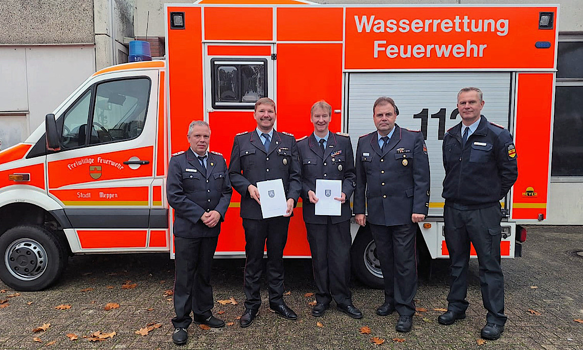 Als Dank für die Dienste als Feuerwehrlehrtaucher wurden Stefan Bussmann (Alfhausen) und Klaus Berentzen (Haren) mit dem Ehrenzeichen in Silber des Nds. Feuerwehrverbandes geehrt. Die Ehrung nahm der Vorsitzende des Feuerwehrverbandes Altkreis Meppen e.V. Wolfgang Veltrup vor.