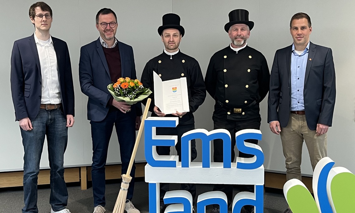 Exeler und Torsten Pohlmann von der Schornsteinfegerinnung Osnabrück-Emsland gratulierten zur erneuten Übernahme des Kehrbezirks, den Lake bereits seit Mai 2019 führt. Die erneute Bestellung dauert für weitere sieben Jahre bis Ende April 2033 an und endet mit der Neuausschreibung des Kehrbezirks. Bewerberinnen und Bewerber müssen persönlich und fachlich geeignet sein, die erforderlichen Rechtskenntnisse sowie die handwerksrechtlichen Voraussetzungen besitzen, um diese anspruchsvolle Aufgabe ausüben zu können.