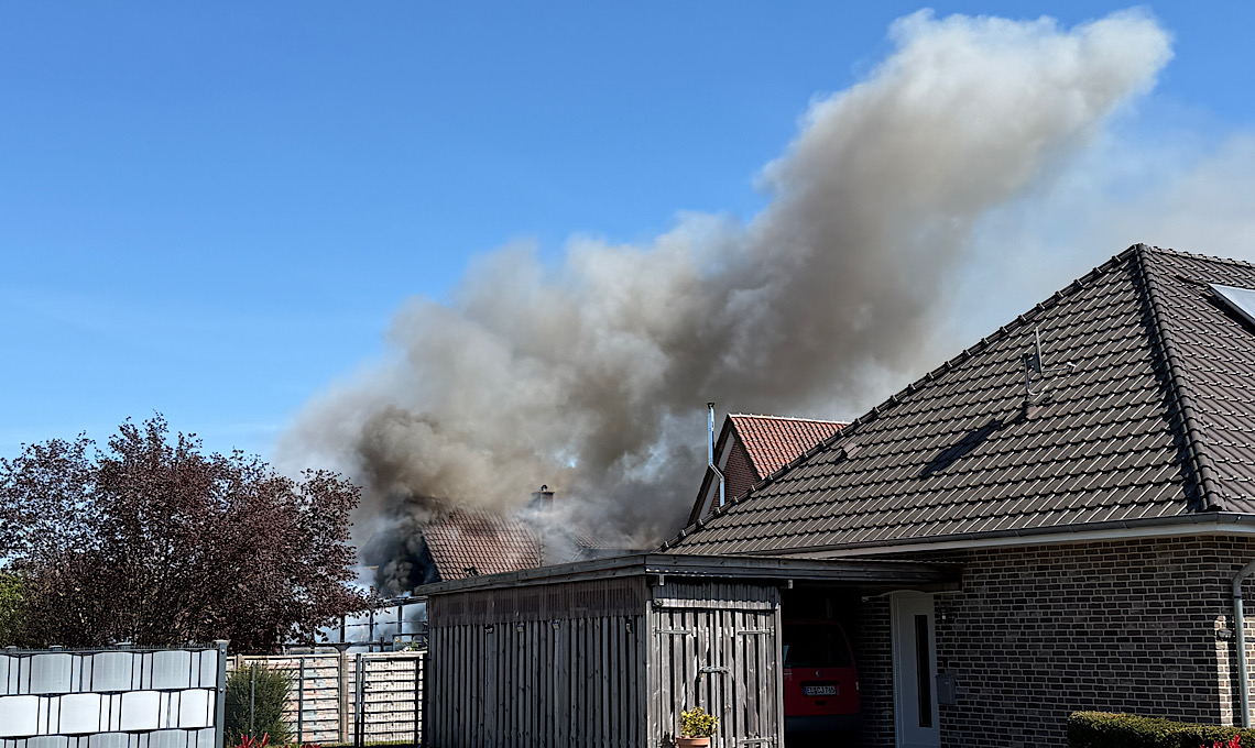 Der Alarm erreichte die Feuerwehr um kurz vor 13 Uhr. Im hinterem Bereich eines Wohnhauses kam es zu einem Brand in dessen Verlauf die Flammen auf das Wohnhaus übergriffen. Umgehend wurde die Alarmstufe erhöht und neben den Kräften der Feuerwehr Rütenbrock auch die Feuerwehr Haren hinzugezogen. Die Löscharbeiten gestalten sich umfangreich. Auch eine Drehleiter wird eingesetzt.